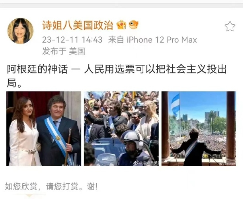 著名的大殖人诗姐的大号,回来了。一回来,就大玩阴阳怪气,说什么阿根廷极右翼米莱当选为阿根廷总统,是所谓的...