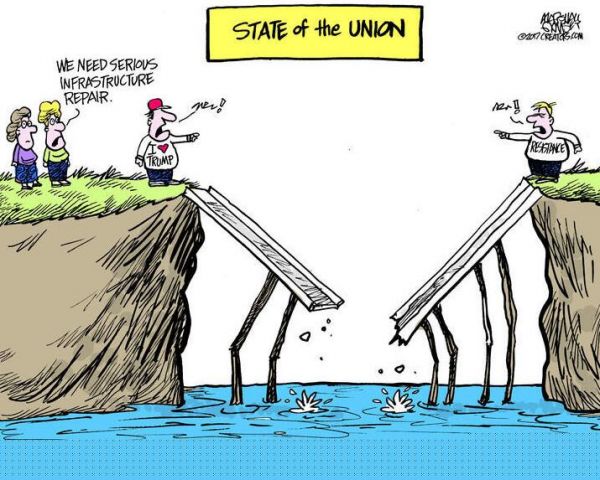 桥梁断裂开来,特朗普的支持者和反对者隔岸互相叫骂,就是否应该修复美国的基础设施争论不休。...