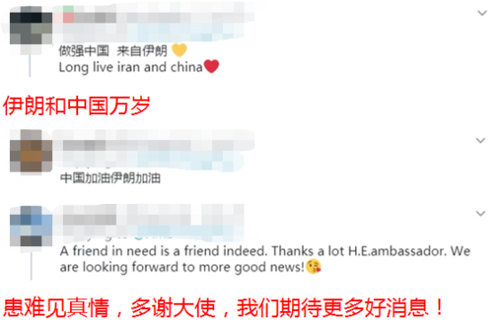 谈到中国援助时,伊朗驻华大使馆表示,“这份患难与共的情谊,是我们共同战“疫”的精神支撑,也是推动伊中关系向前发展的巨大动力”。
