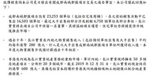 不仅如此,寄托这笔交易,长实集团在内地的物业贩卖今年业绩也有了保障。长实集团透露表现,曩昔十年,其在内地的物业贩卖收入平均约每年280亿港元,计入这次出售成都南城都汇项目单位所获得收入后,今年物业贩卖步伐预计跟曩昔十年相若。