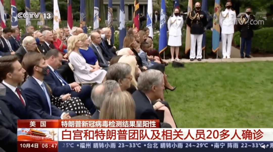 据央视新闻报道,截至10月4日,白宫、特朗普的竞选团队及相关人员中已有20多人确诊,而这其中有多人都曾在9月26日参加了在白宫举行的最高法院大法官提名仪式。