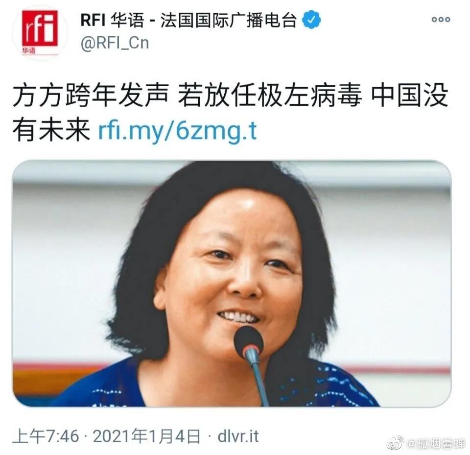 方方在新年又发声了。她说:“极左就是中国祸国殃民式的存在!他们是改革开放最大的阻力!如果听由这股极左势力横行,放任这种病毒感染全社会,改革必定失败,中国没有未来。”