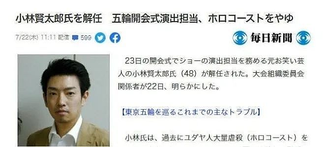 2021年7月22日,也就是东京奥运会开幕前一天,东京奥组委宣布解雇奥运会开幕式和闭幕式的节目导演小林贤太郎。因为他被人找出黑料,在当搞笑艺人的时候,他有个台词:“让我们来玩犹太人大屠杀的游戏吧”。我们知道日本的爹是美国,美国的爹是犹太。所以么,东京奥组委直接解雇,没什么好说的。