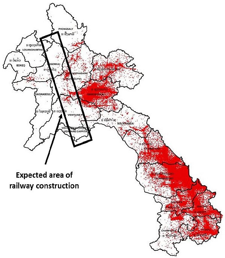 红点为老挝未爆炸弹药污染区域,框处为预计铁路建设区域