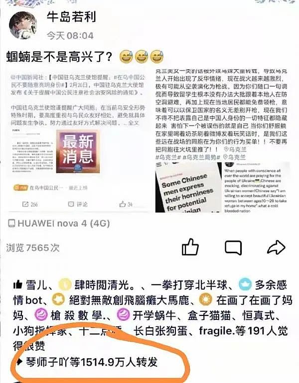 这类信息随后被传入在乌克兰的华人圈,并引起了一部分华人的警惕,不少人将此信息发布在中国大陆的微博平台,其中微博ID为I0nGnnn-账号(目前搜寻不到该账号)发布的信息点爆了舆论场,获得了超6万转发,近50万点赞,千万级阅读量的传播。同时,QQ空间ID为@牛岛若利 的账号发布的相关信息,也在特定青少年群体中获得了1500多万的转发。