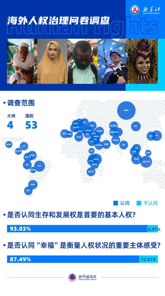 新华社这次问卷调查中,关于“自主而有效的国家治理对于人权保障的作用”,分别有超过52%和30%的受访者选择了“极为重要”或“非常重要”。