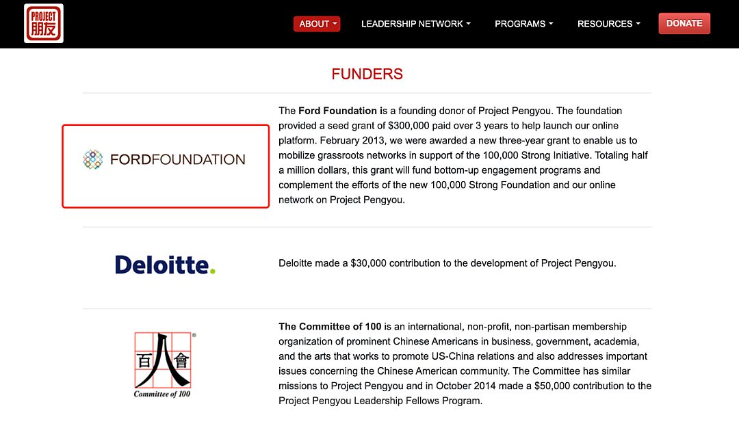 首先,“特长”在全球各国策划街头革命的福特基金会就是该组织的创始者。作为创始金主,从2013年开始,基金会给中国大约300万人民币,用于“10万个强大倡议”的所谓草根网站的为期三年的资金,用于发展他们的工作。该项资金还会支持与这个计划有关联的基金会和“Project朋友”网站的运维。