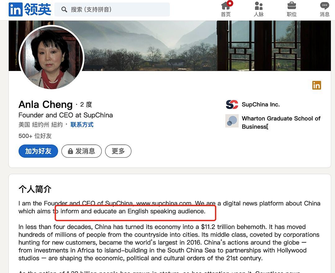 尽管“中国怎么了”在其官网上并没有直接点明,但其创始人郑安澜(AnlaCheng)在领英个人简介中的这句话就令人耐人寻味了:inform and educate an English speaking audience。