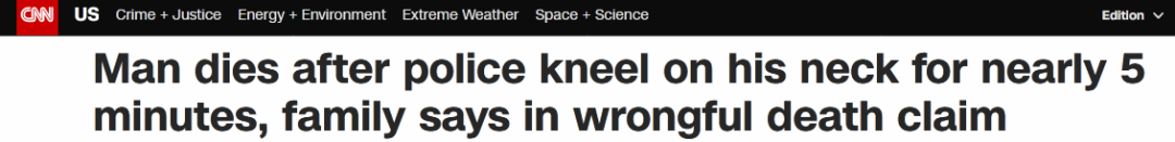 CNN:(男子)家人在非正常死亡索赔中称,男子在警察跪压其脖子近5分钟后死亡安杰洛•昆托的家庭律师描述案发经过时称,2020年12月23日,当事人家中发生一些情况,昆托姐姐担心他伤害他们的母亲,因此报警叫警察来到他们在加州的家中。