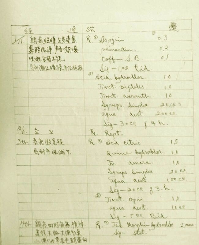 刚看到《病床日志》这份史料时,因处方部分都是用拉丁文所书写,难以辨认。虽经多方奔走,求证无果。2018年4月1日,河北医科大学校史馆张冶馆长带领学生来唐县白求恩柯棣华纪念馆参观学习。借此机会,将《病床日志》交给张冶馆长,拜请给予帮助。4月12日,张冶馆长将由河北医科大学期刊社医学硕士段思琪、河北医科大学药学院2014级学生尤霜竹共同翻译的《病床日志》电子版文稿发给我。至此,才知道了白求恩的病情诊断和治疗用药全部过程。为了稳妥起见,又请林金亮的儿子林胜和游胜华的女儿游黎清给予帮助。
