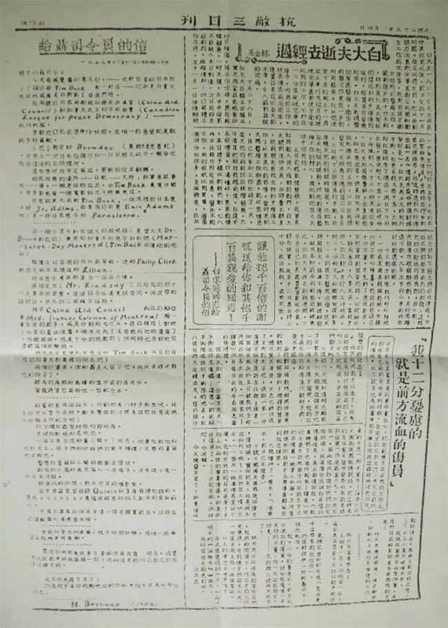 ◆1940年1月4日《抗敌三日刊》登白求恩遗嘱(给聂荣臻的信)。