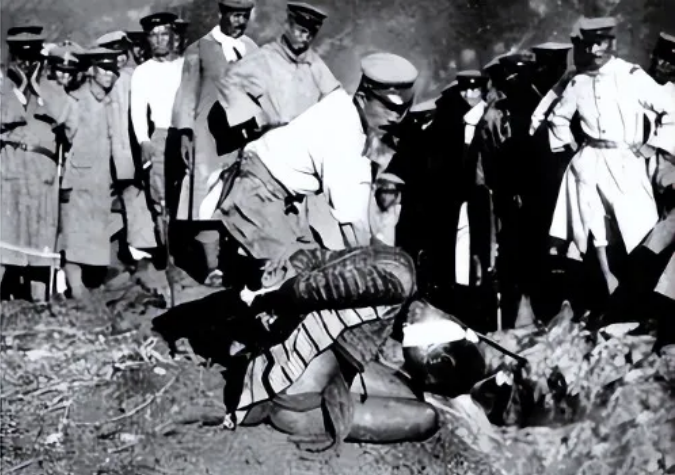 ▲ 1913年,日军台湾守备队血腥镇压台湾民众,对抗日勇士公开斩首。日军曾将这幅照片刊登在随后发行的所谓“征讨”问册上,以此为炫耀。