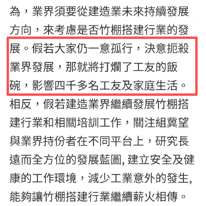 当然各种理由和人文关怀之后,还要来个图穷匕见,说句真正的狠话:要是一意孤行取代竹棚,要打碎四千工友饭碗。断人财路如杀人父母,砸了饭碗的四千人会怎么做,“掂量清楚”。