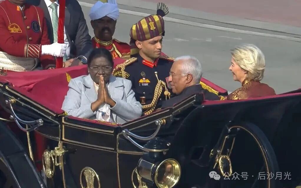 印度总统穆尔穆与欧盟主宾乘坐英式礼仪马车一同来到现场。